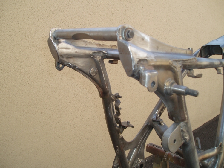 Comme je ne suis pas sûr de conserver l'excroissance du cadre qui ne sert plus à rien (la partie qui est serrée dans l'étau sur la photo en dessous. A l'origine, ça servait à la fixation du pot, à la fixation des cale-pieds passager